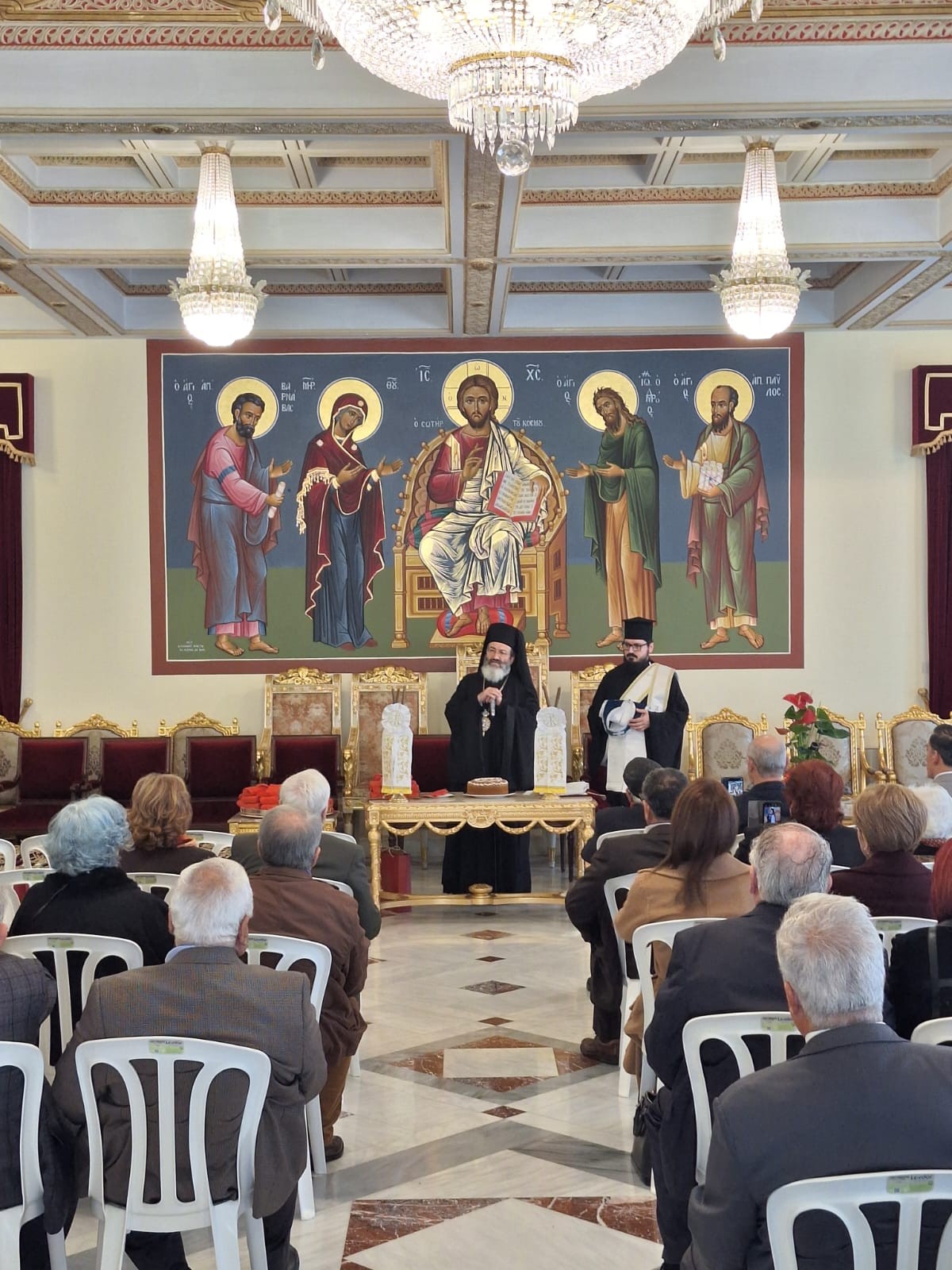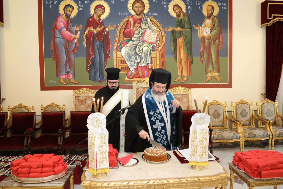 Την κοπή της βασιλόπιτας τέλεσε, εκ μέρους του Μακαριωτάτου Αρχιεπισκόπου Κύπρου, ο Επίσκοπος Μεσαορίας κ. Γρηγόριος με τον Διάκονο π. Ανδρέα Ματέι. Τα τροπάρια έψαλλαν οι Επίτροποι.
