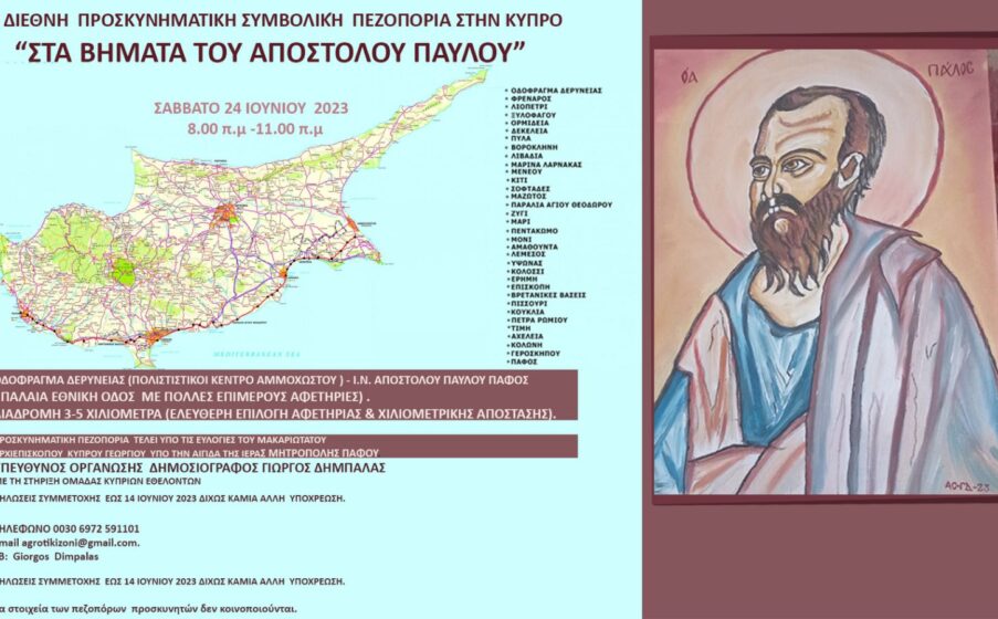 Η Κύπρος στα βήματα του Αποστόλου Παύλου: Η 1η Διεθνής Προσκυνηματική Συμβολική πεζοπορία διοργανώνεται στην Κύπρο το Σάββατο 24 Ιουνίου, 8.00-11.00 π.μ με Αφετηρία το Πολιτιστικό κέντρο ελεύθερης Αμμοχώστου, κοντά στο οδόγραφμα της Δερύνειας.