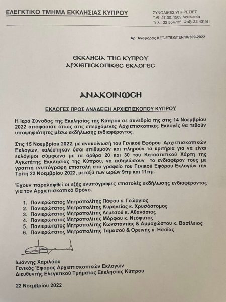 Στις 14 Νοεμβρίου, η Ιερά Σύνοδος της Εκκλησίας της Κύπρου, σε συνεδρία της, υπό την προεδρία του Μητροπολίτη Πάφου Γεώργιου, Τοποτηρητή του Αρχιεπισκοπικού Θρόνου, αποφάσισε τη διενέργεια των εκλογών για ανάδειξη Τριπροσώπου από το λαό, το οποίο θα παραπεμφθεί στην Ιερά Σύνοδο, την Κυριακή, 18 Δεκεμβρίου 2022.