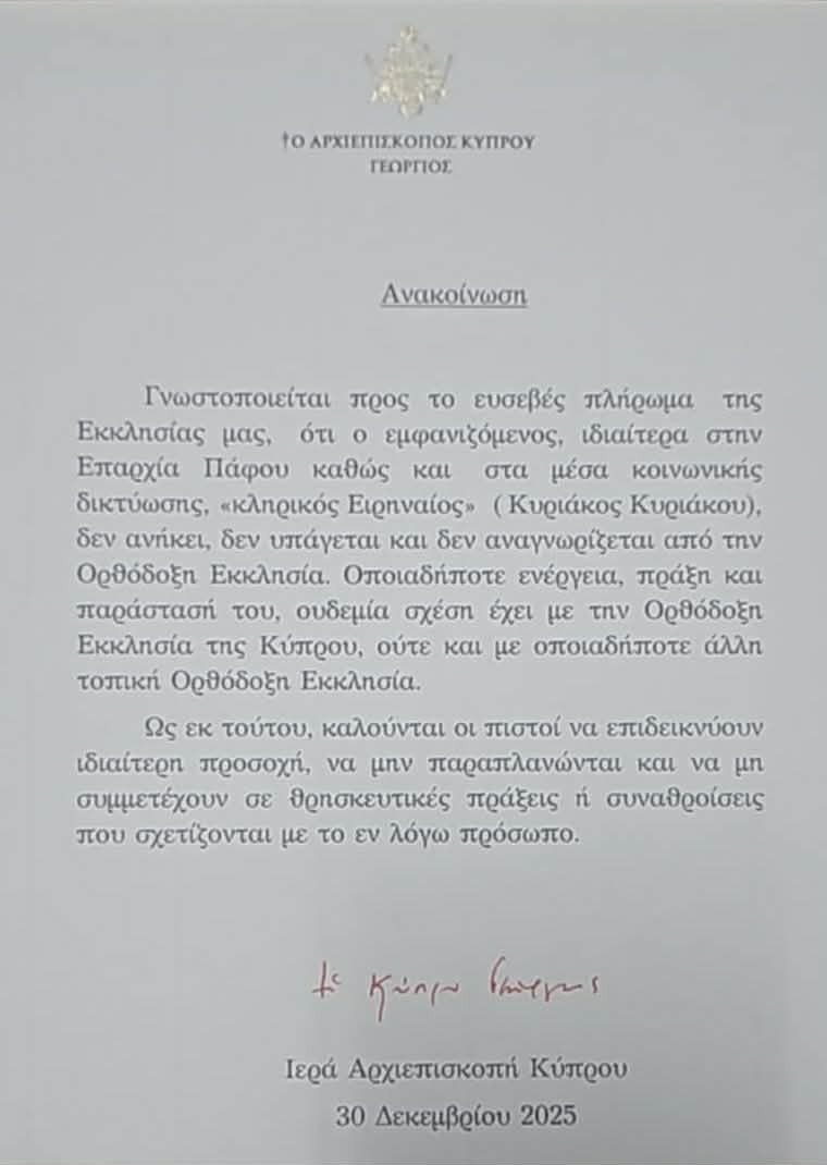 Με γραπτή του δήλωση ο Αρχιεπίσκοπος Κύπρου κ.κ. Γεώργιος ενημερώνει το πλήρωμα της Εκκλησίας της Κύπρου ότι συγκεκριμένο άτομο που εμφανίζεται ως μέλος της ιεραρχίας δεν αναγνωρίζεται από την Εκκλησία και ως εκ τούτου καλεί τους πιστούς να μην παραπλανώνονται από αυτόν και τις ενέργειες του.