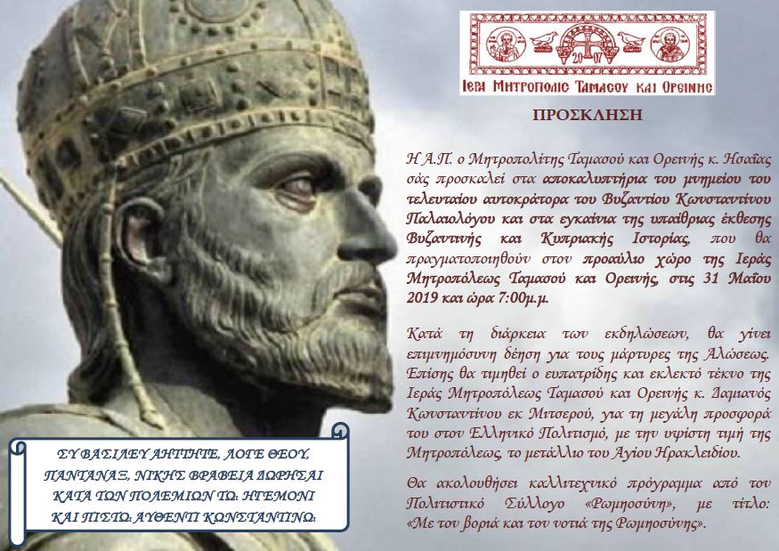 Α.Π. ο Μητροπολίτης Ταμασού και Ορεινής κ. Ησαΐας σάς προσκαλεί στα αποκαλυπτήρια του μνημείου του τελευταίου αυτοκράτορα του Βυζαντίου Κωνσταντίνου Παλαιολόγου και στα εγκαίνια της υπαίθριας έκθεσης Βυζαντινής και Κυπριακής Ιστορίας, που θα πραγματοποιηθούν στον προαύλιο χώρο της Ιεράς Μητροπόλεως Ταμασού και Ορεινής, στις 31 Μαΐου 2019 και ώρα 7:00μ.μ.
