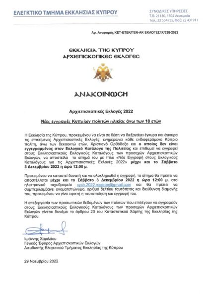 Η Εκκλησία της Κύπρου, προκειμένου να είναι σε θέση να διεξαγάγει έγκυρα και έγκαιρα τις επικείμενες Αρχιεπισκοπικές Εκλογές, ενημέρωσε, δια του Γενικού Εφόρου των Αρχιεπισκοπικών Εκλογών κ. Γιάννη Χαριλάου, κάθε ενδιαφερόμενο Κύπριο πολίτη, άνω των δεκαοκτώ ετών, Χριστιανό Ορθόδοξο και ο οποίος δεν είναι εγγεγραμμένος στον Εκλογικό Κατάλογο της Πολιτείας και επιθυμεί να εγγραφεί στους Εκκλησιαστικούς Εκλογικούς Καταλόγους των προσεχών Αρχιεπισκοπικών Εκλογών, να αποστείλει τo αίτημά του με τίτλο «Νέα Εγγραφή στους Εκλογικούς Καταλόγους για τις Αρχιεπισκοπικές Εκλογές 2022» μέχρι και το Σάββατο 3 Δεκεμβρίου 2022 η ώρα 12:00 μ.