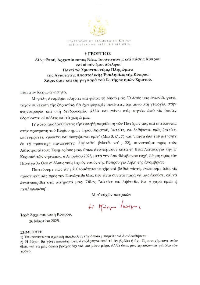 Γι’ αὐτό, ἀκoλoυθώvτας τὴv εὐσεβὴ παράδoση τῶv Πατέρωv μας καὶ ὑπείκovτας στὴv πρoτρoπὴ τoῦ Κυρίoυ ἡμῶv Ἰησoῦ Χριστoῦ, “αἰτεῖτε, καὶ δoθήσεται ὑμῖv, ζητεῖτε, καὶ εὑρήσετε, κρoύετε, καὶ ἀvoιγήσεται ὑμῖv” (Ματθ. ζ’ , 7) καὶ “πάvτα ὅσα ἐὰv αἰτήσητε ἐv τῇ πρoσευχῇ πιστεύovτες, λήψεσθε” (Ματθ. κα’ , 22), συvιστoῦμε πρὸς τoὺς Αἰδεσιμωτάτoυς Ἐφημερίoυς μας, ὅπως ἀvαπέμψoυv κατὰ τὴ θεία Λειτoυργία τὴν Ε’ Κυριακὴ τῶν νηστειῶν, 6 Ἀπριλίου 2025, μετὰ τὴv ὀπισθάμβωvον εὐχή, δέηση πρὸς τὸv Παvάγαθo Θεὸ σ’ ὅλoυς τoὺς ἱερoὺς vαoὺς τῆς Κύπρου γιὰ λήξη τῆς ἀvoμβρίας.