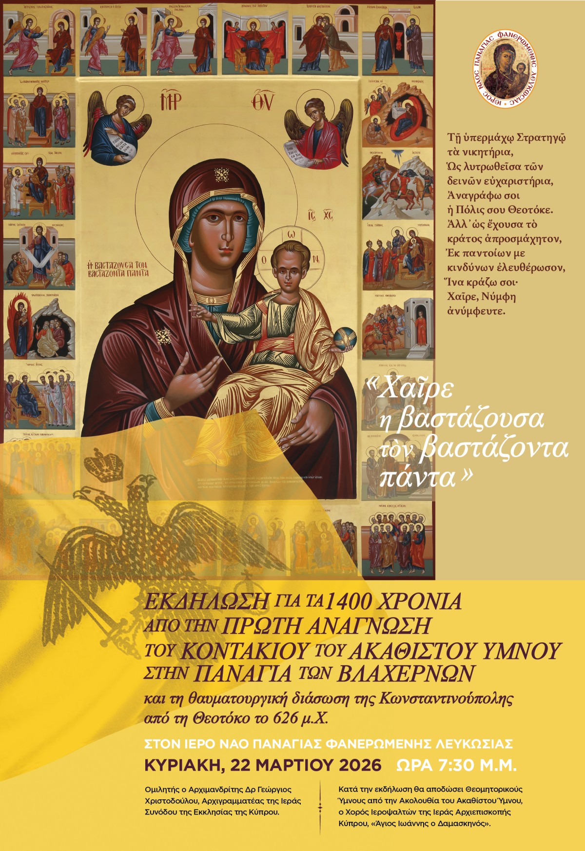 Ο Ιερός Ναός Παναγίας Φανερωμένης Λευκωσίας με την συμπλήρωση 1400 χρόνων από την πρώτη ανάγνωση του Κοντακίου του Ακαθίστου Ύμνου στην Παναγία των Βλαχερνών και την θαυματουργική διάσωση της Κωνσταντινούπολης από την Θεοτόκο το 626 μ.Χ. διοργανώνει την εκδήλωση