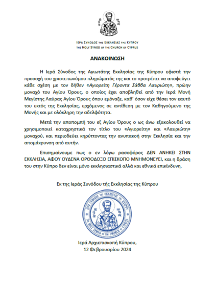 “Μετά την αποπομπή του εξ Αγίου Όρους ο ως άνω εξακολουθεί να χρησιμοποιεί καταχρηστικά τον τίτλο του «Αγιορείτη» και «Λαυριώτη» μοναχού, και περιοδεύει κηρύττοντας την ανυπακοή στην Εκκλησία και την απομάκρυνση από αυτήν. Επισημαίνουμε πως ο εν λόγω ρασοφόρος ΔΕΝ ΑΝΗΚΕΙ ΣΤΗΝ ΕΚΚΛΗΣΙΑ, ΑΦΟΥ ΟΥΔΕΝΑ ΟΡΘΟΔΟΞΟ ΕΠΙΣΚΟΠΟ ΜΝΗΜΟΝΕΥΕΙ, και η δράση του στην Κύπρο δεν είναι μόνο εκκλησιαστικά αλλά και εθνικά επικίνδυνη”, αναφέρει.