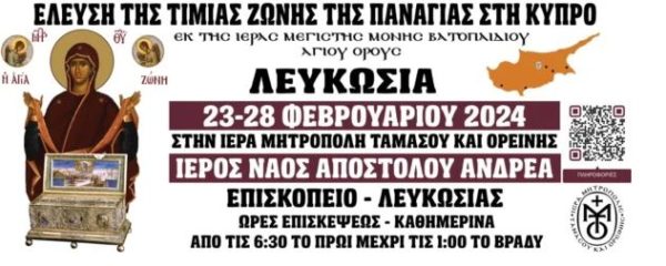 Η υποδοχή θα γίνει στις 16: 30 στον Ιερό Προσκυνηματικό Ναό Αποστόλου Ανδρέα, στον περίβολο της Ιεράς Μητρόπολης Ταμασού και Ορεινής, στο Επισκοπείο. Αναλυτικά το πρόγραμμα παραμονής και προσκύνησης της Αγίας Ζώνης στην Ιερά Μητρόπολη Ταμασού: