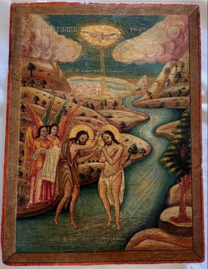 Σύμφωνα με την ανακοίνωση, η εικόνα της Βάπτισης του Χριστού έργο μαθητών του αγιογράφου Κορνάρου Κρητός, ζωγραφίσθηκε το 1852 και είναι διαστάσεων 50,2 x 37,8 εκ.