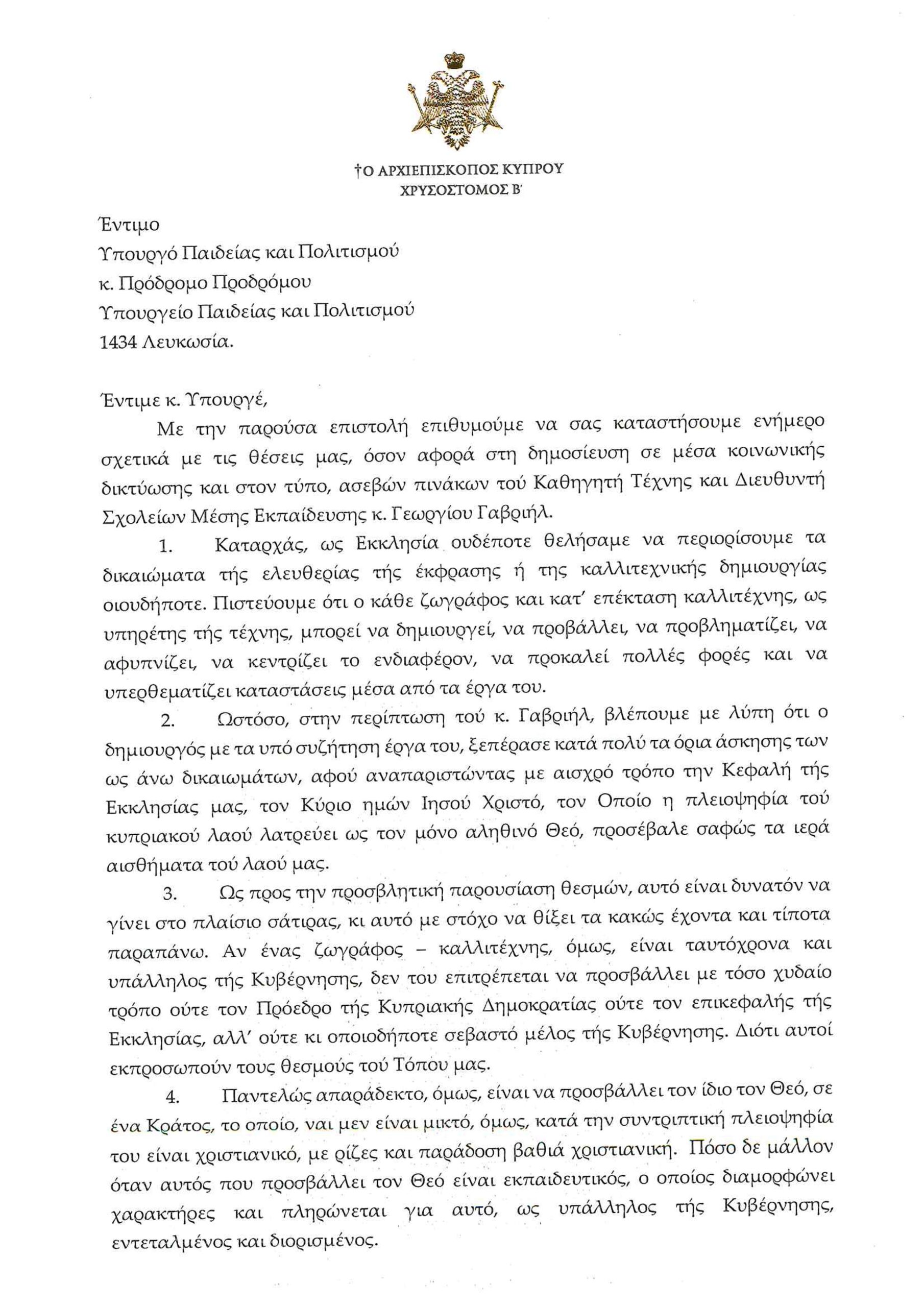 Την απομάκρυνση του Καθηγητή Τέχνης και Διευθυντή Σχολείων Μέσης Εκπαίδευσης κ. Γεωργίου Γαβριήλ, από το εκπαιδευτικό σύστημα της χώρας, ζητεί με επιστολή του προς τον Υπουργό Παιδείας και Πολιτισμού της Κύπρου, κ. Πρόδρομο Προδρόμου, ο Αρχιεπίσκοπος Κύπρου, κ.κ. Χρυσόστομος. Ο εν λόγω καθηγητής δημιούργησε και δημοσίευσε σε μέσα κοινωνικής δικτύωσης και στον τύπο, ασεβείς πίνακες που απεικονίζουν τον Ιησού και ιστορικές προσωπικότητες της Κύπρου.
