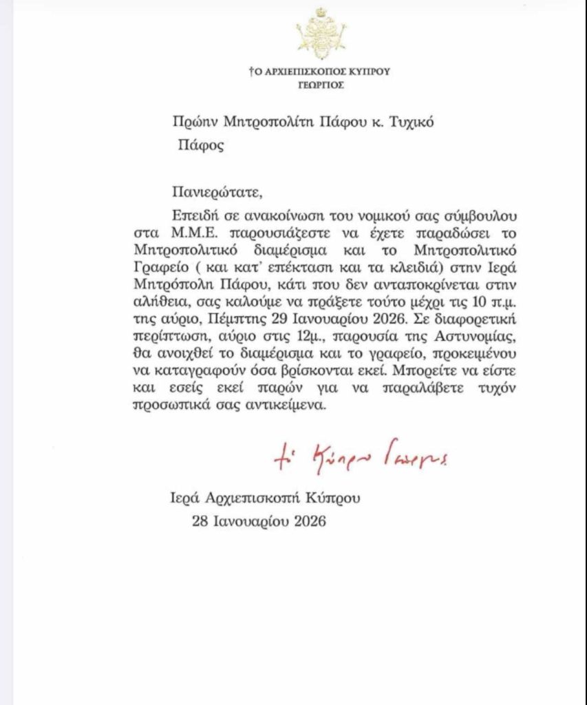 Ο Αρχιεπίσκοπος Κύπρου Γεώργιος καλεί τον πρώην Μητροπολίτη Πάφου Τυχικό να παραδώσει το Μητροπολιτικό διαμέρισμα και το Μητροπολιτικό Γραφείο και κατ΄επέκταση και τα κλειδιά στην Ιερά Μητρόπολη Πάφου μέχρι τις 10:00 αύριο το πρωί της Πέμπτης.
