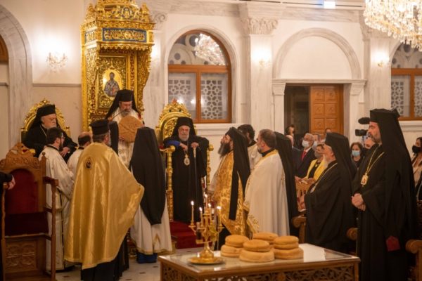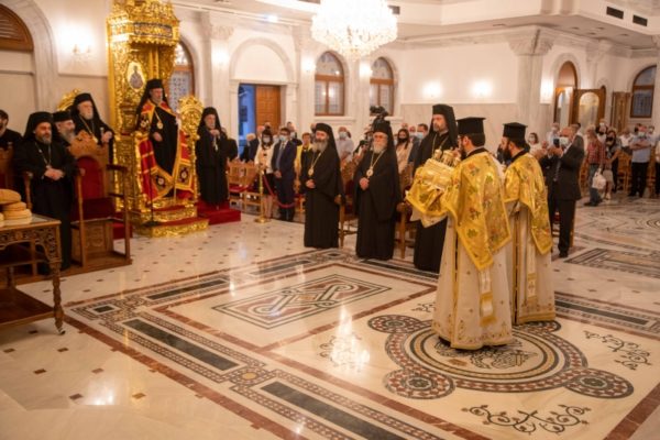 Μετά τη σύντομη δεξίωση, ξεκίνησε ο Πανηγυρικός Εσπερινός των Εγκαινίων και της εορτής τού Ιδρυτού τής Εκκλησίας Κύπρου αποστόλου Βαρνάβα, χοροστατούντος τού Μακαριωτάτου Αρχιεπισκόπου Κύπρου κ.κ. Χρυσοστόμου. Όπως ορίζει η τάξις τής ακολουθίας των Εγκαινίων, λίγο πριν την έναρξη τού Εσπερινού, ο Αρχιερέας κομίζει στον ιερό ναό τμήματα μαρτυρικών λειψάνων, τα οποία μετά τον καταρτισμό τους στο ιερό δισκάριο, τοποθετήθηκαν στο χώρο τής ιεράς Πρόθεσης.
