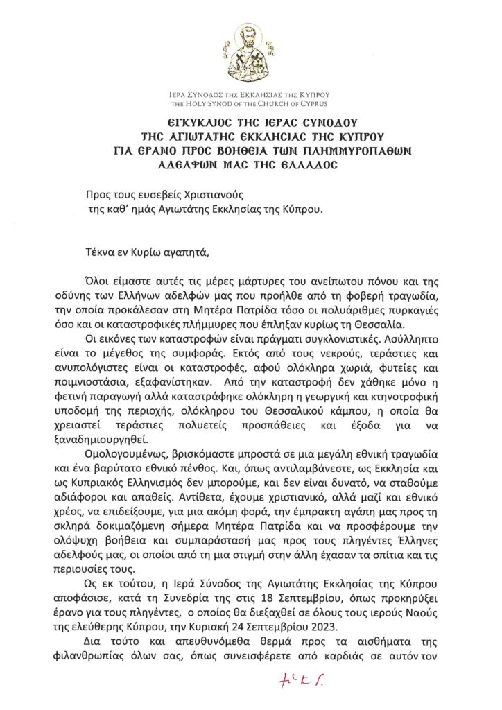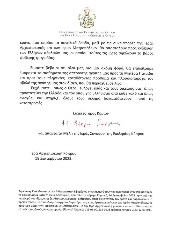 Κατά τη συνεδρίασή της τη Δευτέρας 18 Σεπτεμβρίου 2023 η Ιερά Σύνοδος της Εκκλησίας της Κύπρου αποφάσισε να διεξαχθεί έρανος για την ενίσχυση των δοκιμαζομένων συμπολιτών μας.