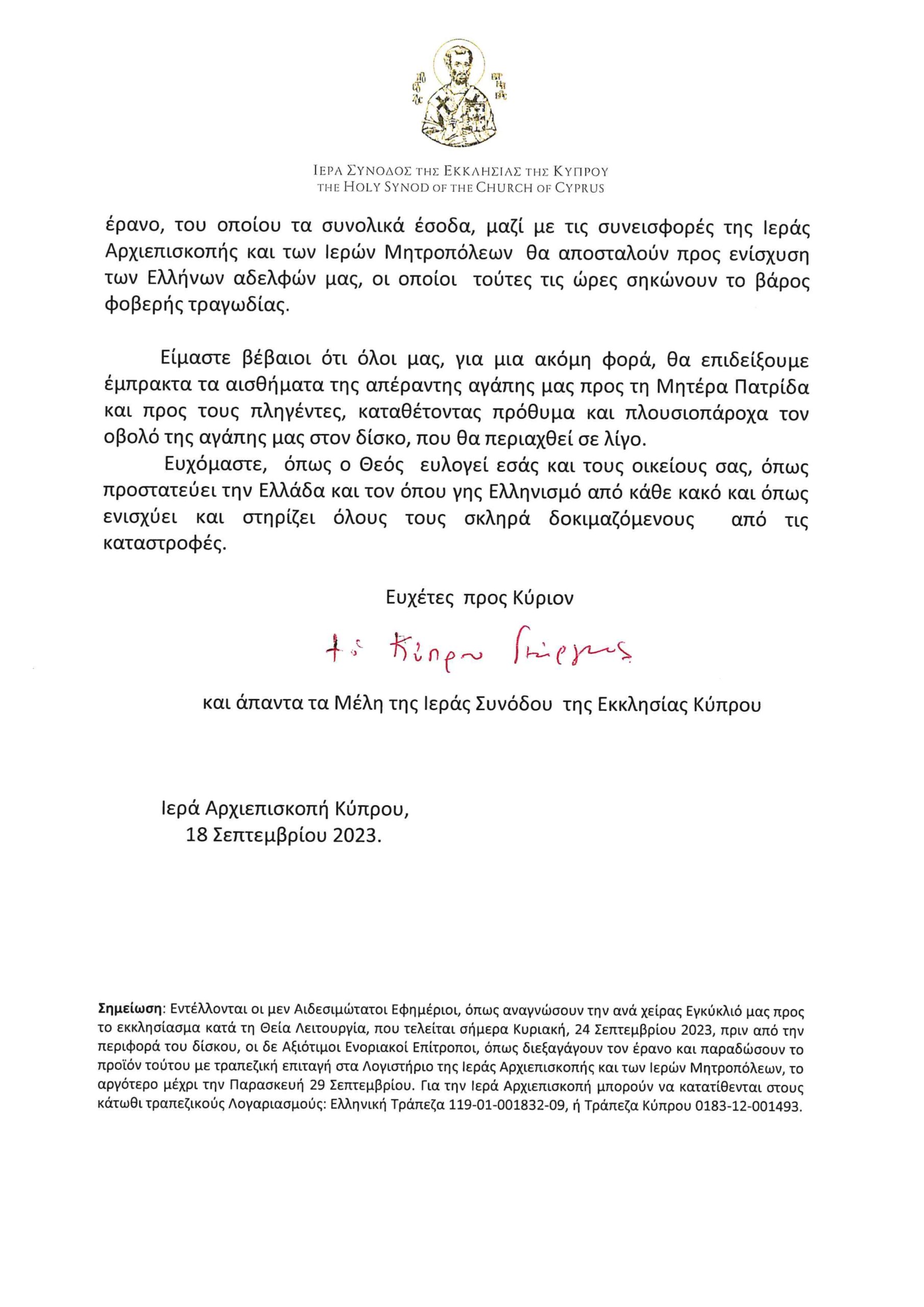 Σημείωση: Εντέλλονται οι μεν Αιδεσιμώτατοι Εφημέριοι, όπως αναγνώσουν την ανά χείρας Εγκύκλιό μας προς το εκκλησίασμα κατά τη Θεία Λειτουργία, που τελείται σήμερα Κυριακή, 24 Σεπτεμβρίου 2023, πριν από την περιφορά του δίσκου, οι δε Αξιότιμοι Ενοριακοί Επίτροποι, όπως διεξαγάγουν τον έρανο και παραδώσουν το προϊόν τούτου με τραπεζική επιταγή στα Λογιστήριο της Ιεράς Αρχιεπισκοπής και των Ιερών Μητροπόλεων, το αργότερο μέχρι την Παρασκευή 29 Σεπτεμβρίου. Για την Ιερά Αρχιεπισκοπή μπορούν να κατατίθενται στους κάτωθι τραπεζικούς Λογαριασμούς: Ελληνική Τράπεζα 119-01-001832-09, ή Τράπεζα Κύπρου 0183-12-001493.