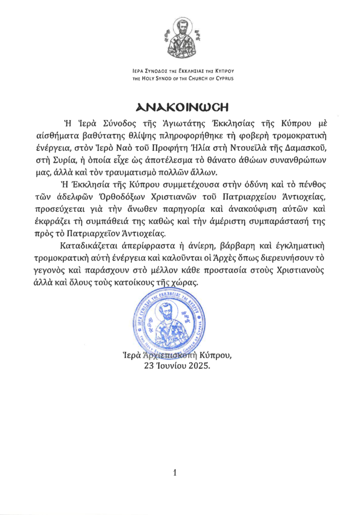 Η Ιερά Σύνοδος της Εκκλησίας της Κύπρου με αισθήματα βαθύτατης θλίψης πληροφορήθηκε τη φοβερή τρομοκρατική ενέργεια, στον Ιερό Ναό του Προφήτη Ηλία στη Ντουειλά της Δαμασκού, στη Συρία, η οποία είχε ως αποτέλεσμα το θάνατο αθώων συνανθρώπων, αλλά και τον τραυματισμό πολλών άλλων.