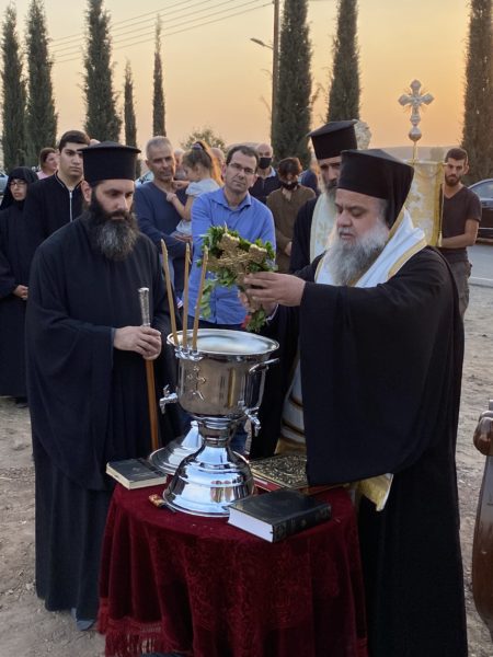 Τον Αγιασμό τέλεσε ο Πανιερώτατος Μητροπολίτης Κιτίου κ. Νεκτάριος, ο οποίος στη συνέχεια κατάθεσε τον θεμέλιο λίθο στο κέντρο του υπό ανέγερση Ιερού Ναού, συμπαραστατούμενος από κληρικούς της Ιεράς Μητροπόλεως Κιτίου. Έπειτα, ο Πανιερώτατος χοροστάτησε κατά την Ακολουθία του Εσπερινού στο Καθολικό της Ιεράς Μονής Παναγίας Ρόδον το Αμάραντον με την ευκαιρία της εορτής του Αγίου Ενδόξου Πανευφήμου Αποστόλου και Ευαγγελιστού Ματθαίου.