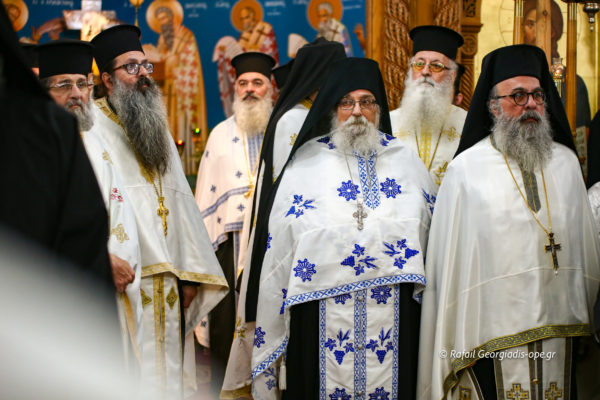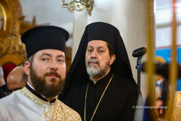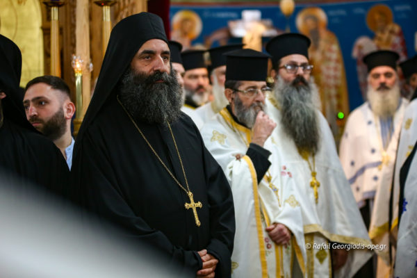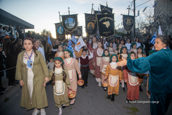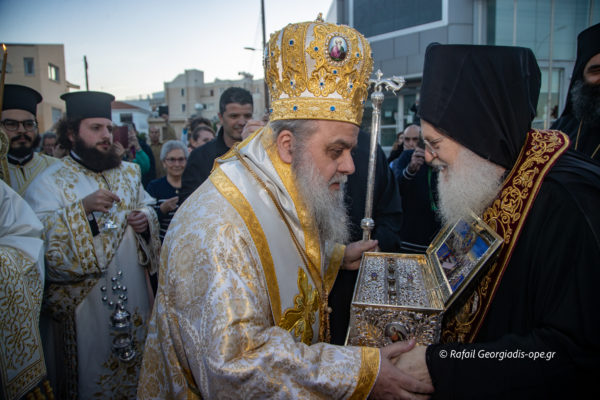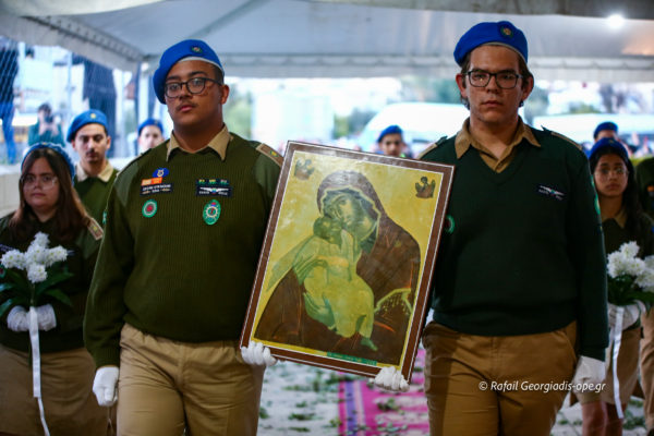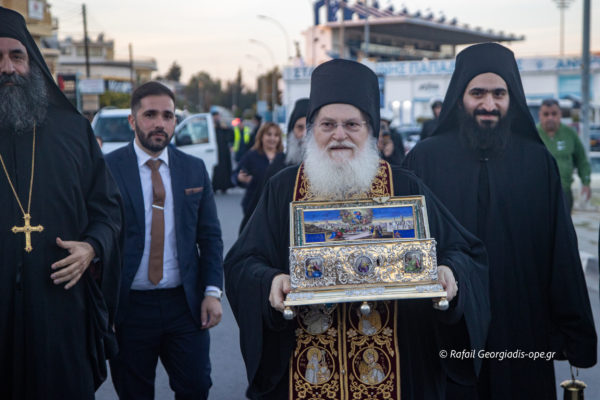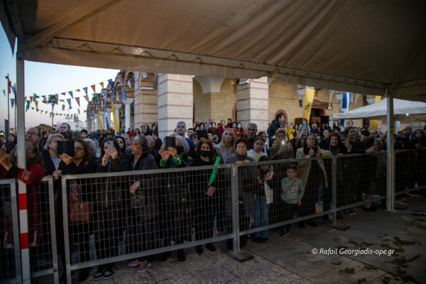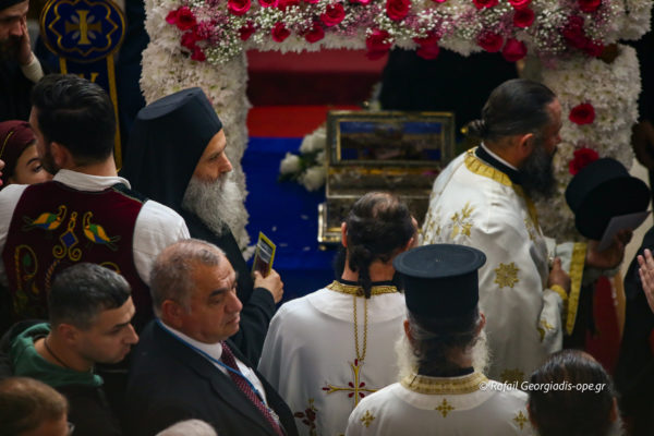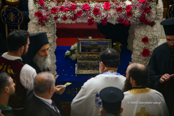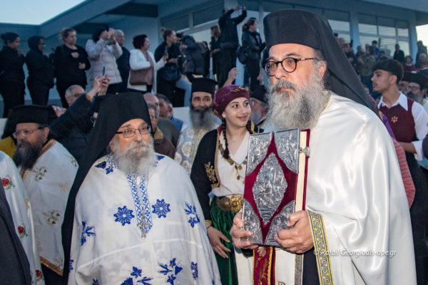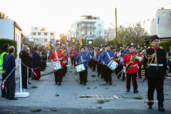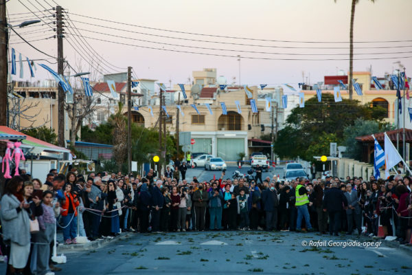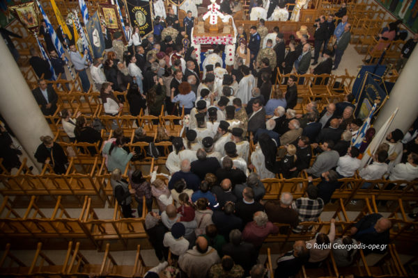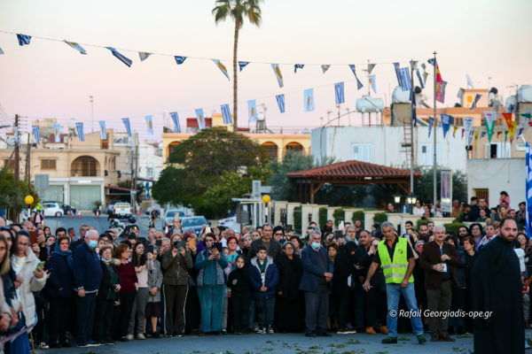 Με αργό βηματισμό και ψαλμωδίες η πομπή έφτασε λίγο μετά τις 6 το απόγευμα στον Ιερό Ναό Αγίας Θέκλας όπου ο πιστός λαός έψαλλε το “Τη Υπερμάχω” και τον “Εθνικό Ύμνο” .