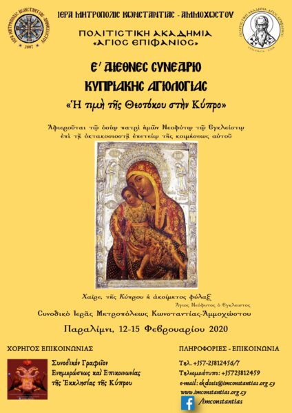 Η Ιερά Μητρόπολη Κωνσταντίας και Αμμοχώστου και η Πολιτιστική Ακαδημία «Άγιος Επιφάνιος» ανακοινώνουν τη διοργάνωση του Ε΄ Διεθνούς Συνεδρίου Κυπριακής Αγιολογίας με  θέμα: “Η τιμή της Θεοτόκου στην Κύπρο”.