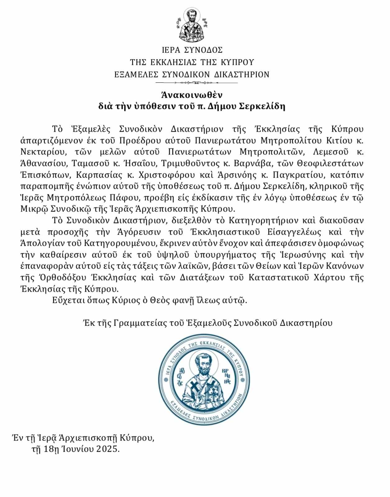 Σύμφωνα με ανακοίνωση που εξέδωσε η Γραμματεία του Εξαμελούς Συνοδικού Δικαστηρίου, το Εξαμελές Συνοδικό Δικαστήριο της Εκκλησίας της Κύπρου απαρτιζόμενο εκ του Προέδρου αυτού Μητροπολίτου Κιτίου Νεκταρίου, των μελών αυτού Μητροπολιτών, Λεμεσού Αθανασίου, Ταμασού Ησαίου, Τριμυθούντος Βαρνάβα, των Επισκόπων, Καρπασίας Χριστοφόρου και Αρσινόης Παγκρατίου, κατόπιν παραπομπής ενώπιον αυτού της υποθέσεως του π. Δήμου Σερκελίδη, κληρικού της Ιεράς Μητροπόλεως Πάφου, προέβη την Τετάρτη στην εκδίκαση της εν λόγω υπόθεσης στο Μικρό Συνοδικό της Ιεράς Αρχιεπισκοπής Κύπρου.