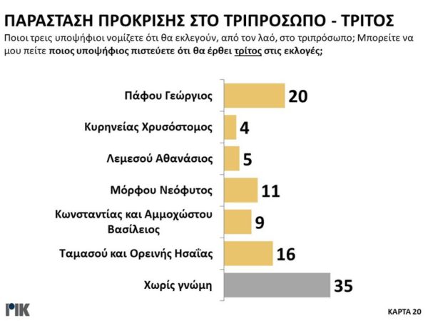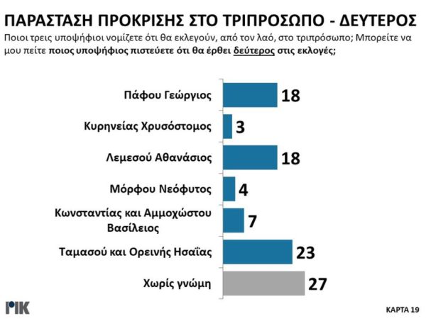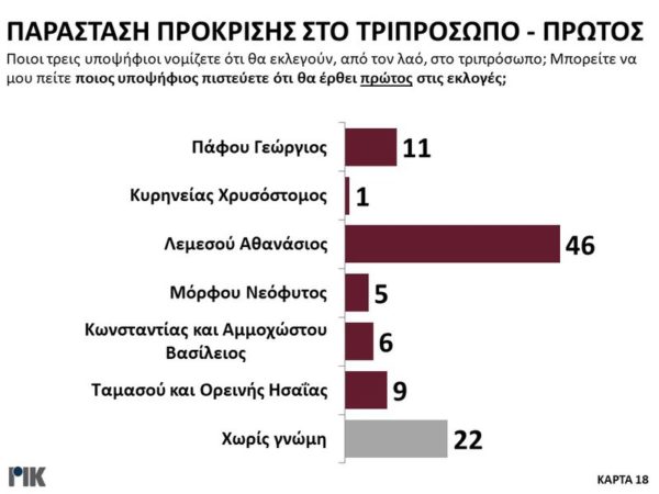 Στην ερώτηση για τους υποψηφίους που θα περάσουν στο τριπρόσωπο, η παράσταση του κόσμου με βάση τις απαντήσεις, προκρίνει τους Λεμεσού Αθανάσιο, Ταμασού και Ορεινής Ησαΐα και Πάφου Γεώργιο.