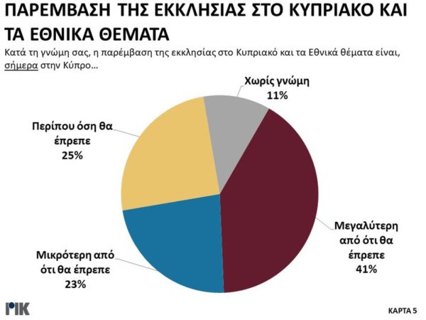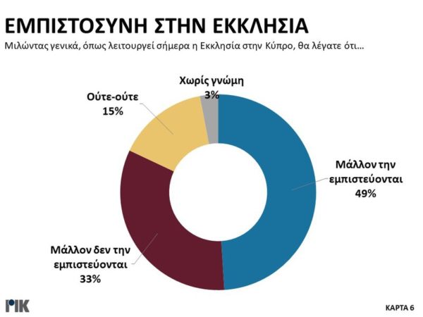 Εξάλλου ποσοστό 49% απάντησε ότι μάλλον εμπιστεύεται την Εκκλησία όπως λειτουργεί σήμερα και 33% ότι μάλλον δεν την εμπιστεύεται.