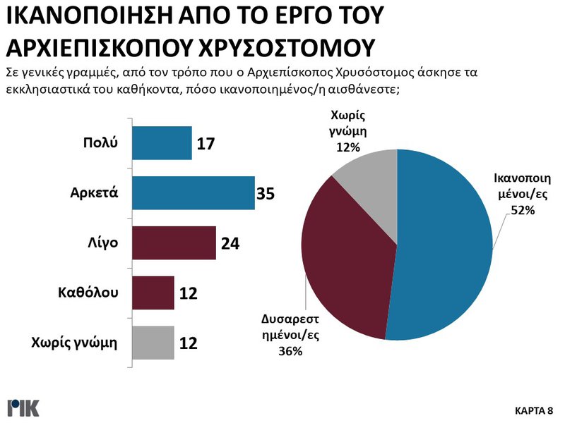 Σε ερώτηση για το έργο του μακαριστού Αρχιεπισκόπου Χρυσοστόμου Β’ ικανοποίηση εξέφρασε το 52%, δυσαρεστημένοι είναι το 36% ενώ χωρίς γνώμη είναι το 12%.