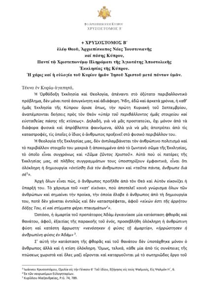 Εγκύκλιο για την ημέρα που γίνεται ειδική μνεία και προσευχή για το «περιβάλλον στοιχείο και την ευστάθεια πάσης της κτίσεως» εξέδωσε η Εκκλησία της Κύπρου. Στην Ελλάδα, η Εκκλησία μας έχει ορίσει αυτό να γίνεται με την Αρχή της Ινδίκτου, την 1η Σεπτεμβρίου. Ωστόσο, στην Κύπρο η Εκκλησία έχει καθιερώσει την πρώτη Κυριακή του Σεπτεμβρίου να αναπέμπονται οι δεήσεις προς τον Θεό τόσο για προστασία όσο και για αποτροπή περιβαλλοντικών καταστροφών, οπότε αυτό το μήνυμα θα αναγνωσθεί την Κυριακή, 5 Σεπτεμβρίου.