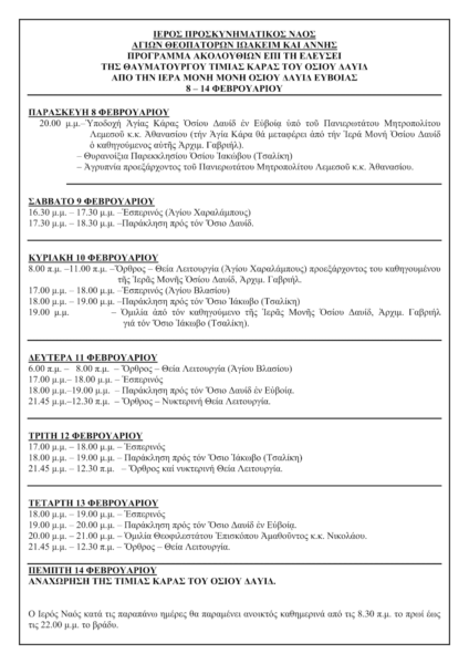 Στον Ιερό Ναό Θεοπατόρων Ιωακείμ και Άννης και Αγίου Στυλιανού (περιοχή Αγίου Τύχωνα) της Μητροπόλεως Λεμεσού, κατά τη Κυριακή 10 Φεβρουαρίου 2019, στις 6:00μ.μ. θα τελεσθεί παράκληση προς τον Όσιο Ιάκωβο και στη συνέχεια θα ακολουθήσει ομιλία από τον Καθηγούμενο της Ιεράς Μονής Οσίου Δαβίδ Ευβοίας, Aρχιμανδρίτoυ, π. Γαβριήλ. Θέμα της ομιλίας «Ο Όσιος Ιάκωβος ο εν Ευβοία».