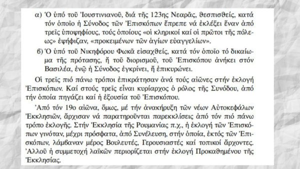 «..Στην Κύπρο τόσο ο Καταστατικός Χάρτης του 1914 όσο  του 1980 διελάμβαναν τη συμμετοχή του λαού στην εκλογή Ειδικών Αντιπροσώπων στην αρχή και Γενικών αργότερα οι οποίοι μαζί με αριθμό οφφικιάλων και τα μέλη της Ιεράς Συνόδου εξέλεγαν τον Επίσκοπο, Αρχιεπίσκοπο ή Μητροπολίτη. Ο ρόλος της Ιεράς Συνόδου στην περίπτωση αυτή είναι υποβαθμισμένος και η εκτροπή από τα παραδεδομένα έκδηλη. Μπορούσε να εκλεγεί Μητροπολίτης ή Αρχιεπίσκοπος κάποιος ο οποίος να μην είχε λάβει έστω μια επισκοπική ψήφο. Η εκ των υστέρων άρνηση της Ιεράς Συνόδου να επικυρώσει μια εκλογή δεν είναι εύκολη υπόθεση. Επιθυμούσα να υπερβεί την πιο πάνω δυσκολία που προέρχεται από αθέτηση Ιερών Κανόνων αλλά και έχουσα υπόψη τις έριδες που αναπτύσσονται ανάμεσα στο λαό και τις προσπάθειες που καταβάλλονται για επηρεασμό των εκλεγομένων Αντιπροσώπων η Ιερά Σύνοδος στο νέο Καταστατικό Χάρτη εισάγει νέο τρόπο εκλογής των Επισκόπων. Ο λαός να ψηφίζει οποιοδήποτε κληρικό έχει τα απαιτούμενα προσόντα και η Ιερά Σύνοδος να επιλέγει ανάμεσα στους τρεις υποψηφίους που θα πάρουν τις περισσότερες ψήφους. Έτσι και ο λαός δεν θα παραγκωνίζεται και η εκλογή θα γίνεται σύμφωνα με τους Ιερούς Κανόνες”.