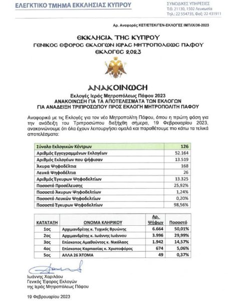 Ανακοινώνοντας τα τελικά αποτελέσματα στην Αρχιεπισκοπή Κύπρου, στη Λευκωσία, ο Γενικός Έφορος Εκλογών της Μητρόπολης Πάφου, κ. Γιάννης Χαριλάου, δήλωσε ότι εντός τριών ημερών μετά την ημέρα των εκλογών που διεξήχθησαν την 19η Φεβρουαρίου, ο οποιοσδήποτε εκλογέας δικαιούται να υποβάλει γραπτώς τις ενστάσεις του κατά της εκλογικής διαδικασίας.
