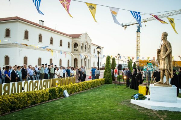 Ακολούθως ο Πανιερώτατος Μητροπολίτης Ταμασού και Ορεινής κ. Ησαΐας τέλεσε τα αποκαλυπτήρια του ανδριάντα του Κωνσταντίνου ΙΑ’ Παλαιολόγου και έγινε κατάθεση στεφάνων ενώπιον του ανδριάντα.