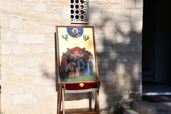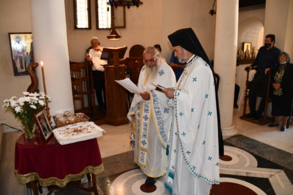 Μπροστά από την Ωραία Πύλη του πετρόχτιστου σε βυζαντινό ρυθμό ναϋδρίου επί μικρής τραπέζης ήταν η φωτογραφία του αειμνήστου Ν. Μαγγίνα, ο δίσκος με τα κόλλυβα και ένα βάζο με άσπρα χρυσάνθεμα.