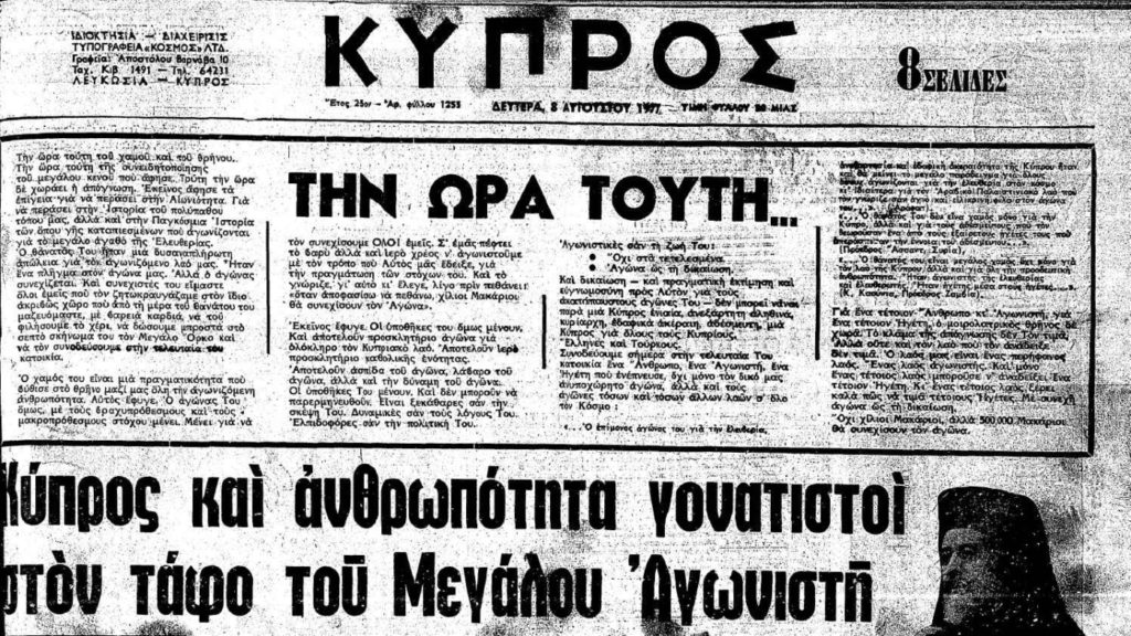 «Θλίψει βαθυτάτη αγγέλλομεν τελευτήν μακαριστού Αρχιεπισκόπου Κύπρου Μακαρίου Γ΄, επισυμβάσαν σήμερον και ώρα 5.15΄ πρωινήν. Κηδεία τελεσθήσεται 8 Αυγούστου και ώραν 9.00΄ πρωινήν».