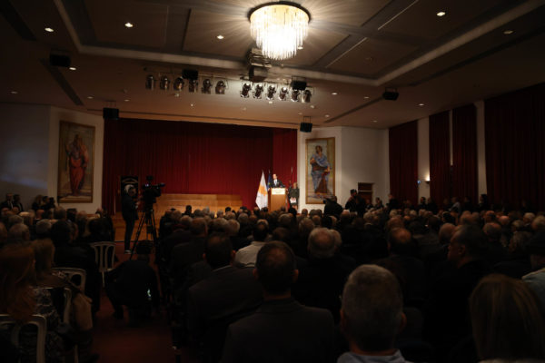 Ο Αρχιεπίσκοπος Κύπρου και ο Νίκος Χριστοδουλίδης σε εκδήλωση προς τιμήν των αγωνιστών της τουρκοανταρσίας 1963-’64