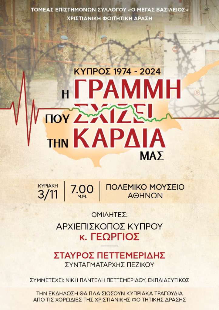 Κεντρικός ομιλητής της επετειακής εκδήλωσης «ΚΥΠΡΟΣ 1974-2024: Η γραμμή που σχίζει την καρδιά μας» θα είναι ο Αρχιεπίσκοπος Κύπρου κ. κ. Γεώργιος. Η εκδήλωση, η οποία διοργανώνεται από τον τομέα επιστημόνων του Συλλόγου Ορθοδόξου Ιεραποστολικής Δράσεως «Ο Μέγας Βασίλειος» σε συνεργασία με τη Χριστιανική Φοιτητική Δράση, θα πραγματοποιηθεί την Κυριακή 3 Νοεμβρίου στις 19:00, στο Πολεμικό Μουσείο Αθηνών
