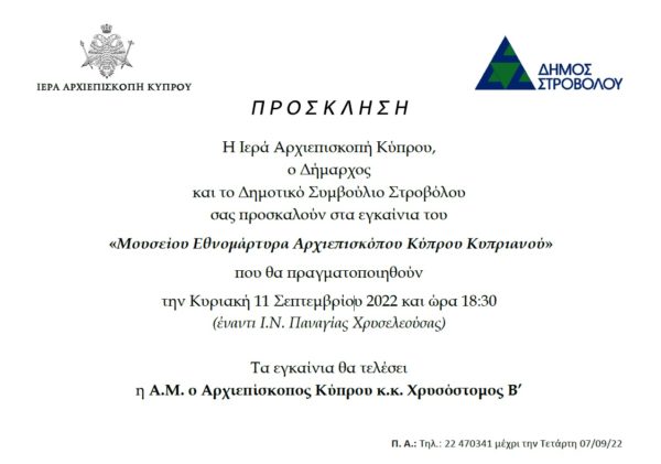 Η Ιερά Αρχιεπισκοπή Κύπρου, ο Δήμαρχος και το Δημοτικό Συμβούλιο Στροβόλου σας προσκαλούν στα εγκαίνια του «Μουσείου Εθνομάρτυρα Αρχιεπισκόπου Κύπρου Κυπριανού» που θα πραγματοποιηθούν την Κυριακή 11 Σεπτεμβρίου 2022 και ώρα 18:30 (έναντι Ι.Ν. Παναγίας Χρυσελεούσας). Τα εγκαίνια θα τελέσει η Α.Μ. ο Αρχιεπίσκοπος Κύπρου κ.κ. Χρυσόστομος Β΄.
