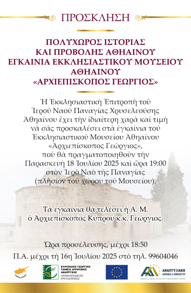 Η Εκκλησιαστική Επιτροπή του Ιερού Ναού Παναγίας Χρυσελεούσης Αθηαίνου έχει την ιδιαίτερη χαρά και τιμή να σας προσκαλέσει στα εγκαίνια του Εκκλησιαστικού Μουσείου Αθηαίνου «Αρχιεπίσκοπος Γεώργιος», που θα πραγματοποιηθούν την Παρασκευή, 18 Ιουλίου 2025 και ώρα 19:00, στον Ιερό Ναό της Παναγίας (πλησίον του χώρου του Μουσείου).