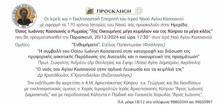 Οι Ιερείς και η Εκκλησιαστική Επιτροπή του Ιερού Ναού Αγίου Κασσιανού με αφορμή τα 170 χρόνια Ιστορίας του Ναού, προσκαλούν στην Ημερίδα: Όσιος Ιωάννης Κασσιανός ο Ρωμαίος “Της Οικουμένης μέγα κειμήλιον και της Κύπρου το μέγα κλέος”, που θα πραγματοποιηθεί την Παρασκευή, 20/12/2024 και ώρα 17:30 στον Ιερό Ναό Αγίου Κασσιανού.