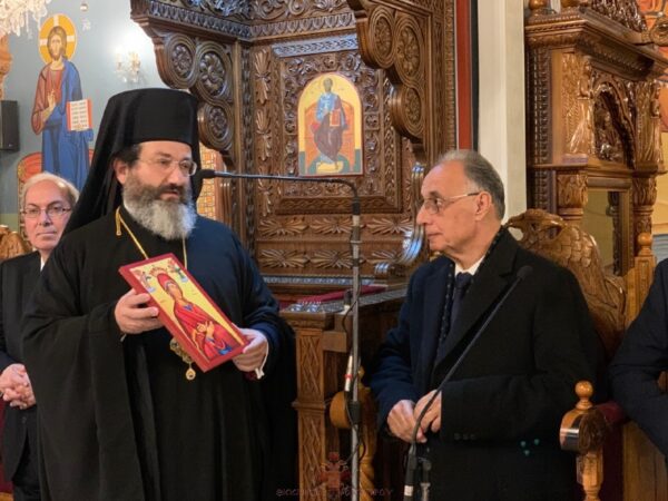 Ο Θεοφιλέστατος προσφωνώντας τον ομιλητή εξήγησε στο εκκλησίασμα που βρίσκονται σήμερα τα ερείπια του Ναού της Παναγίας της Απαλαίστρας (μεταξύ Πυργάς και Σίντας Μεσαορίας). Πήρε αυτό το όνομα επειδή σε εκείνη την περιοχή κατά την ελληνιστική περίοδο υπήρχε Γυμνάσιο, δηλαδή τόπος άσκησης των παλαιστών. Έτσι και η Παναγία μας πήρε το όνομα Απαλαίστρα, γιατί και αυτή αγωνίζεται για τη σωτηρία μας και καταισχύνει τον εχθρό με τη δύναμη που έχει.