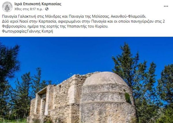 Εκκλησία της Κύπρου 03 Φεβρουαρίου, 2021 Οι σκλαβώμενες “Υπαπαντές” της Κύπρου Διαδώστε: Παναγία Γαλακτινή στις Μάνδρες και Παναγία της Μελίσσας, Ακανθού-Φλαμούδι. Δύο ιεροί Ναοί στην Καρπασία, αφιερωμένοι στην Παναγία και οι οποίοι πανηγύριζαν στις 2 Φεβρουαρίου, ημέρα της εορτής της Υπαπαντής του Κυρίου. Φωτογραφίες: Γιάννης Κυπρή – Πηγή: Ιερά Επισκοπή Καρπασίας Διαδώστε: