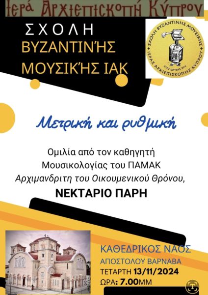 Ομιλία του Αρχιμανδρίτου του Οικουμενικού Θρόνου και Ομοτίμου Καθηγητού Μουσικολογίας, Νεκταρίου Πάρη, με θέμα Ρυθμική και Μετρική θα πραγματοποιηθεί στον Καθεδρικό Ναό του Αποστόλου Βαρνάβα, την Τετάρτη, 13 Νοεμβρίου και ώρα 19:00.
