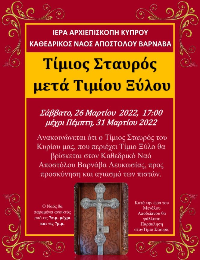Ο Τίμιος Σταυρός του Κυρίου, που περιέχει Τίμιο Ξύλο θα βρίσκεται από το απόγευμα του Σαββάτου 26 Μαρτίου, μέχρι και το απόγευμα της Πέμπτης 31 Μαρτίου 2022, στον Καθεδρικό Ναό Αποστόλου Βαρνάβα Λευκωσίας, προς προσκύνηση και αγιασμό των πιστών, όπως ανακοινώνει προς το ευσεβές πλήρωμα της Εκκλησίας η Ιερά Αρχιεπισκοπή Κύπρου