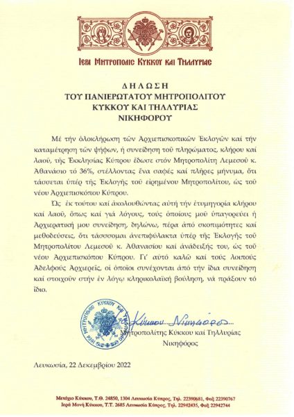 Στην ανακοίνωση αναφέρεται, πως «με την ολοκλήρωση των αρχιεπισκοπικών εκλογών και την καταμέτρηση των ψήφων, η συνείδηση του πληρώματος, κλήρου και λαού, της Εκκλησίας Κύπρου έδωσε στον Μητροπολίτη Λεμεσού Αθανάσιο το 36%, στέλνοντας ένα σαφές και πλήρες μήνυμα, ότι τάσσεται υπέρ της εκλογής του ειρημένου Μητροπολίτου, ως του νέου Αρχιεπισκόπου Κύπρου».