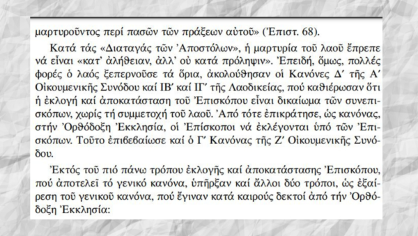 «Στην προ των Οικουμενικών Συνόδων περίοδο το δικαίωμα της εκλογής του Επισκόπου είχαν αυστηρών οι Επίσκοποι. Ο λαός αναφερόταν μόνο στα προσόντα που είχε ο άξιος για το αξίωμα ή αποδεχόταν τον υπό των Επισκόπων εκλεγόμενο», είχε πει ο Μακαριστός Αρχιεπίσκοπος Κύπρου υπογραμμίζοντας: