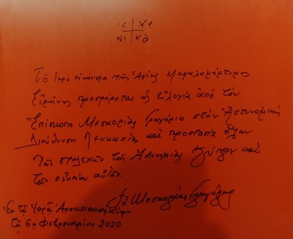 Ο Θεοφιλέστατος, απευθυνόμενος προς όλους τους παρευρισκόμενους, τόνισε τη σπουδαιότητα του ρόλου που έχουν για το καλό της κοινωνίας και την ασφάλεια των πολιτών. Τους παρότρυνε να συνεχίσουν το έργο που επιτελούν με σεβασμό προς τον κάθε άνθρωπο και αγάπη για την πατρίδα τους. Επίσης, μετέφερε τις πατρικές ευχές του Μακαριωτάτου Αρχιεπισκόπου Κύπρου κ. Χρυσοστόμου. Στη συνέχεια ο Επίσκοπος Μεσαορίας προσέφερε, ως ευλογία, για την Αστυνομική Διεύθυνση ένα μεγάλο εικόνισμα της Αγίας Μεγαλομάρτυρος Ειρήνης, προστάτιδος της Κυπριακής Αστυνομίας και στον κάθε παρευρισκόμενο το ημερολόγιο των κατεχόμενων ενοριών της αρχιεπισκοπικής περιφέρειας (Διαμερίσματος Μεσαορίας).
