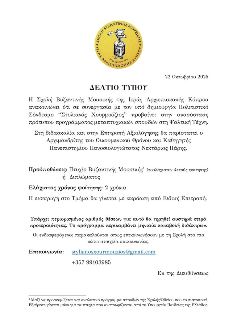 Η Σχολή Βυζαντινής Μουσικής της Ιεράς Αρχιεπισκοπής Κύπρου ανακοινώνει ότι σε συνεργασία με τον υπό δημιουργία Πολιτιστικό Σύνδεσμο “Στυλιανός Χουρμούζιος” προβαίνει στην ανασύσταση πρότυπου προγράμματος μεταπτυχιακών σπουδών στην Ψαλτική Τέχνη.
