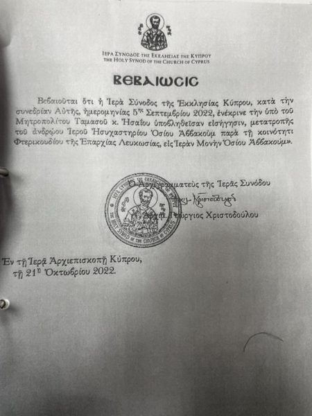 Μάλιστα, στις 5 Σεπτεμβρίου 2022, κατά τη συνεδρία της Ιεράς Συνόδου της Εκκλησίας της Κύπρου, όταν υποβάλαμε αίτημα για ανύψωση του Ησυχαστηρίου σε Ιερά Μονή, γεγονός που σήμαινε την ενθρόνιση του π. Νεκταρίου από Προϊστάμενο σε Ηγούμενο, ο Μακαριστός Αρχιεπίσκοπος Χρυσόστομος ο Β’ και τα λοιπά μέλη της Ιεράς Συνόδου ενέκριναν το αίτημα.