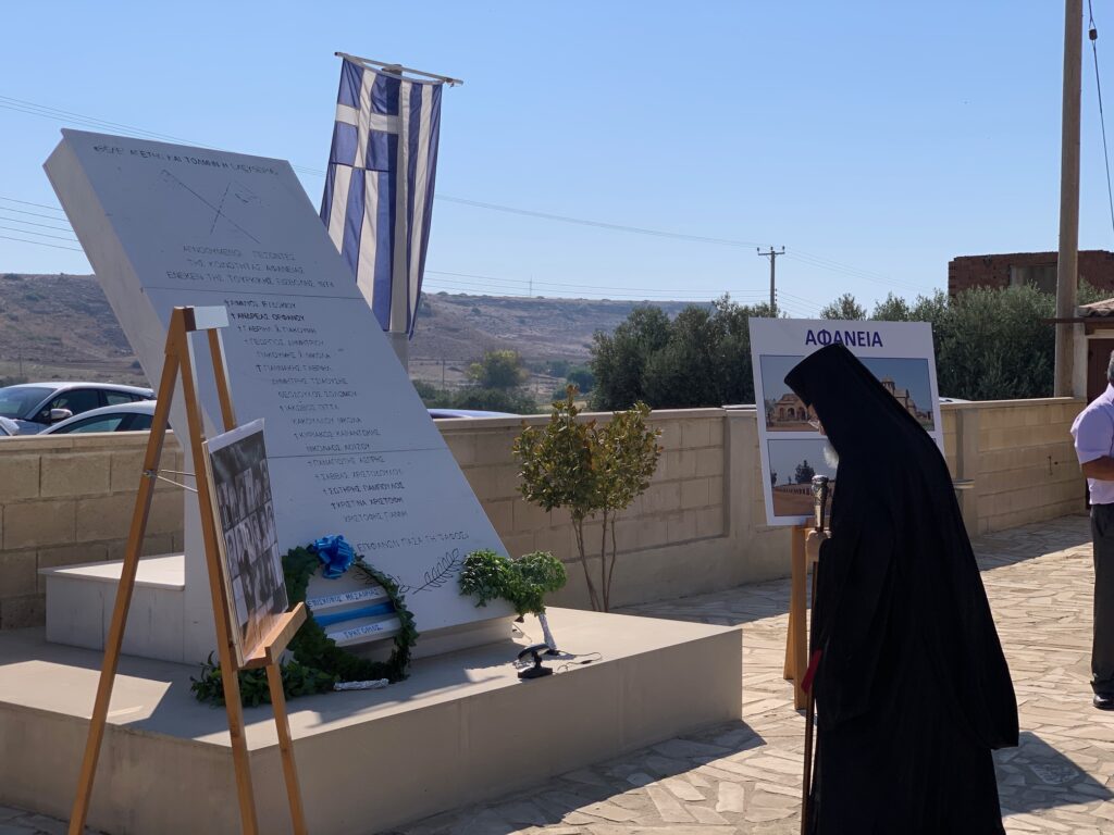 Οι εκτοπισμένοι της κοινότητας Αφάνειας, στον κάμπο της Μεσαορίας, μνημόνευσαν τους οικείους νεκρούς: τους υπέρ Πίστεως και Πατρίδος αγωνισαμένους και πεσόντες κατά τους απελευθερωτικούς αγώνες έως την τουρκική εισβολή του 1974 προς προάσπιση της Κυπριακής Δημοκρατίας, των ιερών και οσίων, της ακαιρεότητας της πατρίδας, των αμάχων θυμάτων της τουρκικής θηριωδίας τον Ιούλιο του 1974 και των ειρήνη τελειωθέντων Αφαντιτών κληρικών, κοινοταρχών, διδασκάλων, ευεργετών, πατέρων και αδελφών.