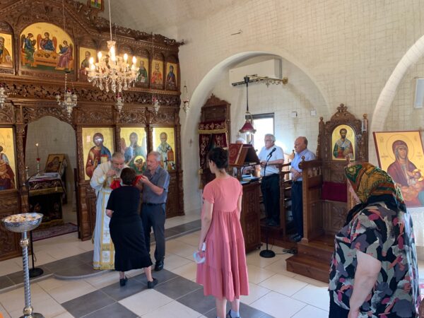 Ακολούθως, ο Επίσκοπος, προσέφερε για το Ναό, στον Πρωτοσύγκελο Αρχιμ. Γρηγόριο, την εικόνα των πέντε Αγίων Επισκόπων Κυθρέας, μεταξύ αυτών και του Αγίου Φωτεινού, που εορτάζει στις 2 Αυγούστου. Αργότερα στην αίθουσα, κατά τη διάρκεια του κεράσματος, προσέφερε την εικόνα της Παναγίας Απαλαίστρας της Πυργάς Μεσαορίας.