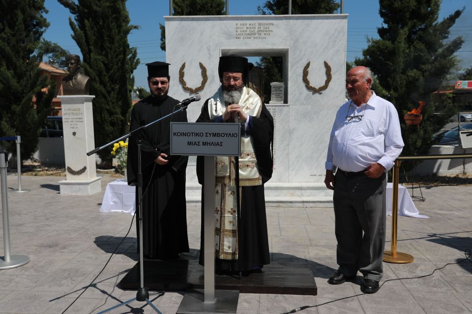 Της Θείας Λειτουργίας προέστη ο Θεοφιλέστατος Επίσκοπος Μεσαορίας κ. Γρηγόριος, ενώ το θείο λόγο κήρυξε ο Πανοσιολογιώτατος Αρχιγραμματέας της Ιεράς Συνόδου, Αρχιμ. Γρηγόριος Μουσουρούλης. Ακολούθησε σεμνή εκδήλωση με προσευχή-τρισάγιο, ομιλίες, τραγούδια και κατάθεση στεφάνων στο προσωρινό οίκημα της κοινότητας Μιας Μηλιάς στην Παλλουριώτισσα. Στεφάνι εκ μέρους της Α. Μ. του Αρχιεπισκόπου Κύπρου κατέθεσε ο Επίσκοπος Μεσαορίας κ. Γρηγόριος.