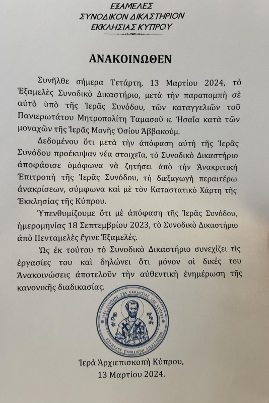 Συνῆλθε σήμερα Τετάρτη, 13 Μαρτίου 2024, τὸ Ἑξαμελὲς Συνοδικὸ Δικαστήριο, μετὰ τὴν παραπομπὴ σὲ αὐτὸ ὑπὸ τῆς Ἱερᾶς Συνόδου, τῶν καταγγελιῶν τοῦ Πανιερωτάτου Μητροπολίτη Ταμασοῦ κ. Ἠσαΐα κατὰ τῶν μοναχῶν τῆς Ἱερᾶς Μονῆς Ὁσίου Ἀββακούμ.