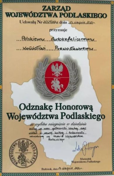 Με αφορμή την 100ή επέτειο της αυτοκεφαλίας της Ορθόδοξης Εκκλησίας της Πολωνίας, οι αρχές της περιφέρειας Podlaskie Voivodeship απένειμαν στην Πολωνική Αυτοκέφαλη Ορθόδοξη Εκκλησία το μετάλλιο “Τιμής του Podlaskie Voivodeship” για τις υπηρεσίες στην τοπική κοινωνία και τη συμβολή στην ανάπτυξη του πολιτισμού και της εθνικής ταυτότητας στην περιοχή.